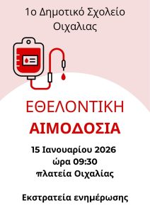 Σας προσκαλούμε την Πέμπτη 15 Ιανουαρίου 2026 και ώρα 09:30 στην εκστρατεία ενημέρωσης για την εθελοντική αιμοδοσία στην πλατεία της Οιχαλίας.